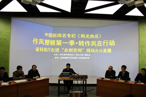 2016年2月29日,省科技廳黨組副書記、副廳長郭玉明帶領(lǐng)高新技術(shù)發(fā)展及產(chǎn)業(yè)化處、中小企業(yè)創(chuàng)新資金管理中心有關(guān)負(fù)責(zé)同志走進(jìn)保定國家大學(xué)科技園“豆芽創(chuàng)客空間”,舉辦“轉(zhuǎn)作風(fēng)·新春走進(jìn)眾創(chuàng)空間”活動(dòng),并依托河北電臺(tái)“陽光熱線”欄目,以“轉(zhuǎn)作風(fēng),積極引導(dǎo)、扶持‘眾創(chuàng)空間’發(fā)展”為主題與創(chuàng)業(yè)導(dǎo)師、創(chuàng)業(yè)者代表近距離、零障礙、無縫隙的交流對(duì)接,傾聽意見,解決難題,現(xiàn)場(chǎng)辦公。